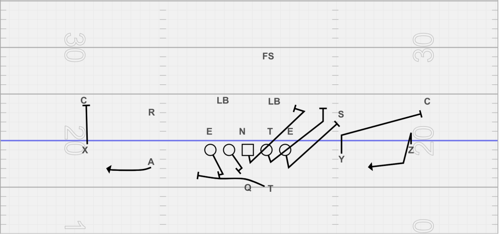 - Receivers: X stalks the corner, A runs the bubble like a decoy drawing fire.