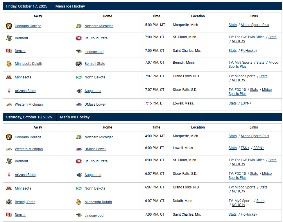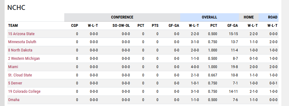 There really isn’t much going on with the standings so far this year, due to no conference games being played. Feel free to see where your team stands after 2 weekends of play. In the Halloween weekend preview, I will break down how the standings work in the NCHC. It’s a little different compared to the NHL.