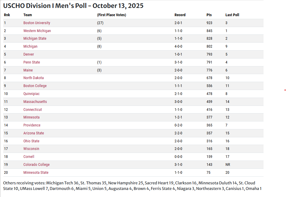 Here is the USCHO Division 1 Men’s Hockey Poll for the week of October 13th, courtesy of uscho.com