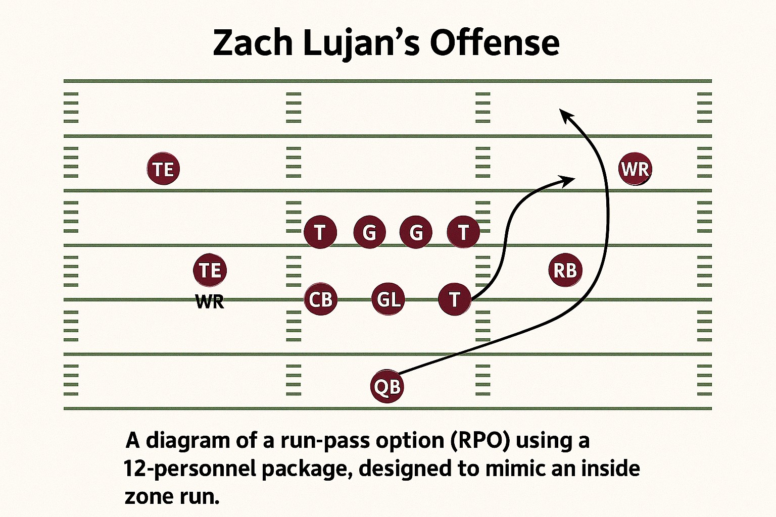 Ironically the Lujan philosophy is anchored in a creative running game and a mix of power blocking concepts like ‘duo’ as well as inside and outside zone.