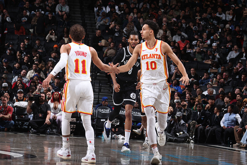 BROOKLYN, NY - APRIL 10: Trae Young #11 high fives Zaccharie Risacher #10 of the Atlanta Hawks during the game against the Brooklyn Nets on April 10, 2025 at Barclays Center in Brooklyn, New York. NOTE TO USER: User expressly acknowledges and agrees that, by downloading and or using this Photograph, user is consenting to the terms and conditions of the Getty Images License Agreement. Mandatory Copyright Notice: Copyright 2025 NBAE (Photo by Nathaniel S. Butler/NBAE via Getty Images)