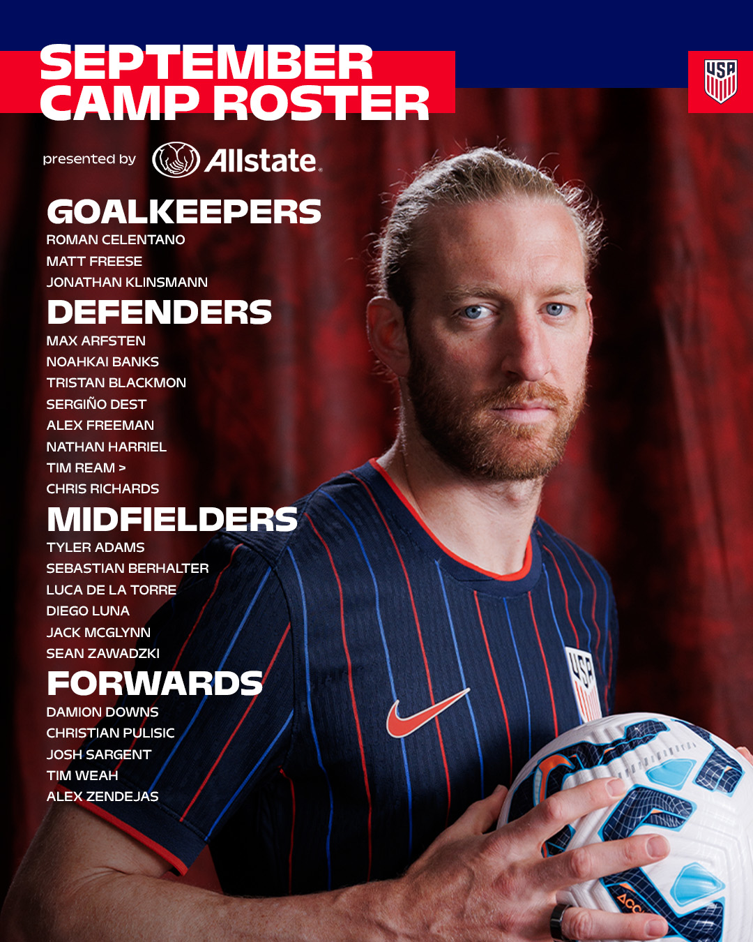 Goalkeepers (3): Roman Celentano (FC Cincinnati), Matt Freese (NYCFC), Jonathan Klinnsmann (Cesena, Italy)